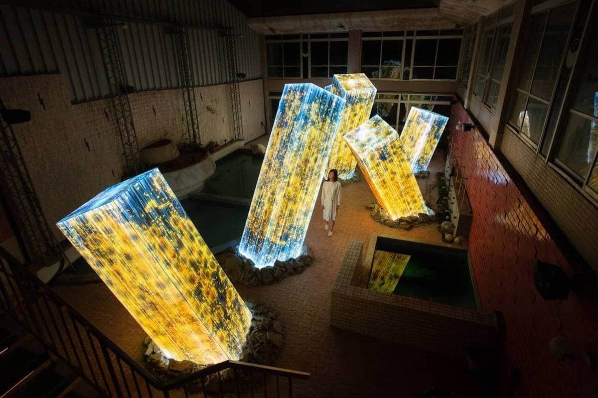 Waanzinnige lichtinstallaties van teamLab in een verlaten, Japans badhuis. Unieke projecties die gedurende een uur alle seizoenen nabootsen. Van watervallen tot bloemen en ze reageren ook nog eens op bezoekers.