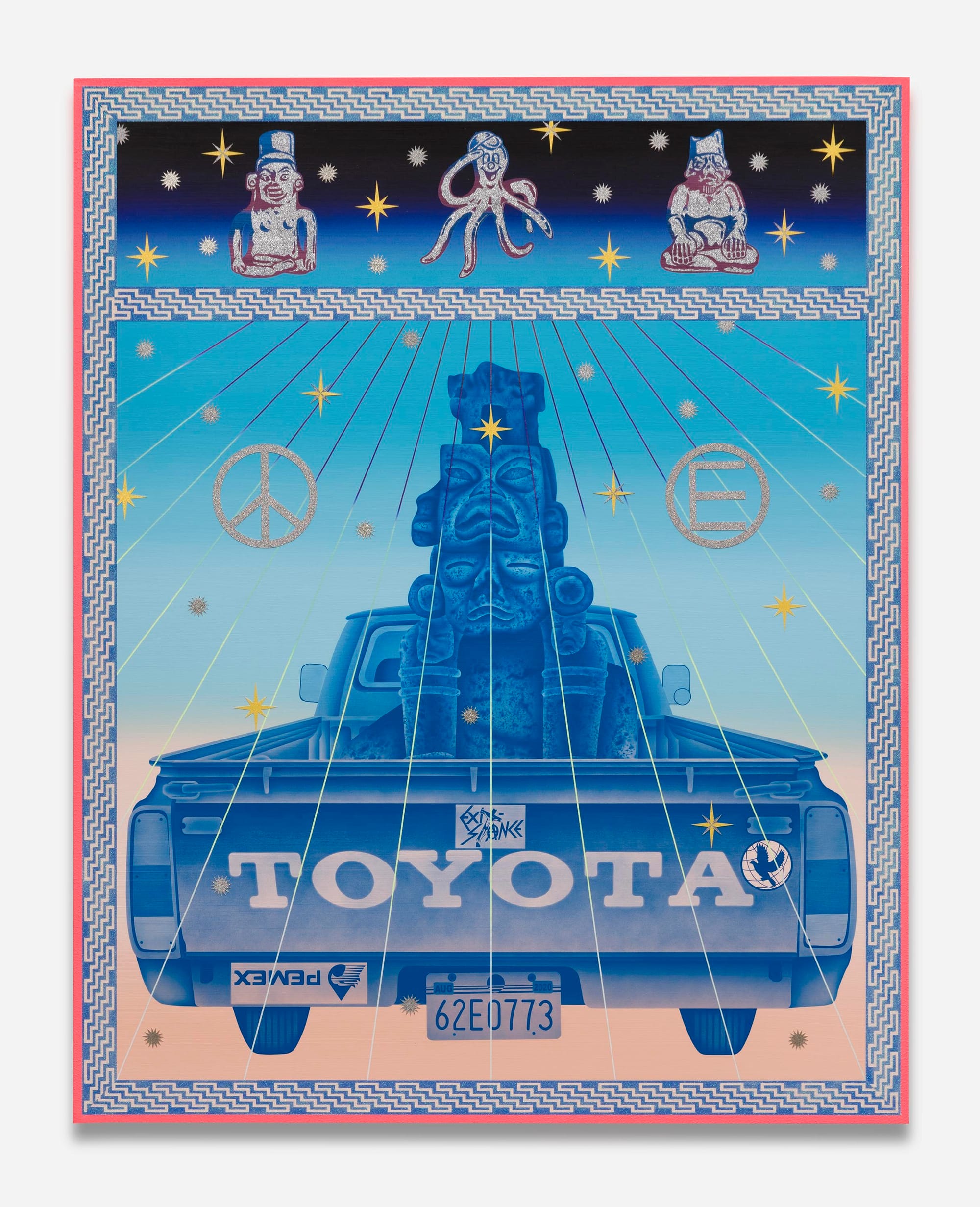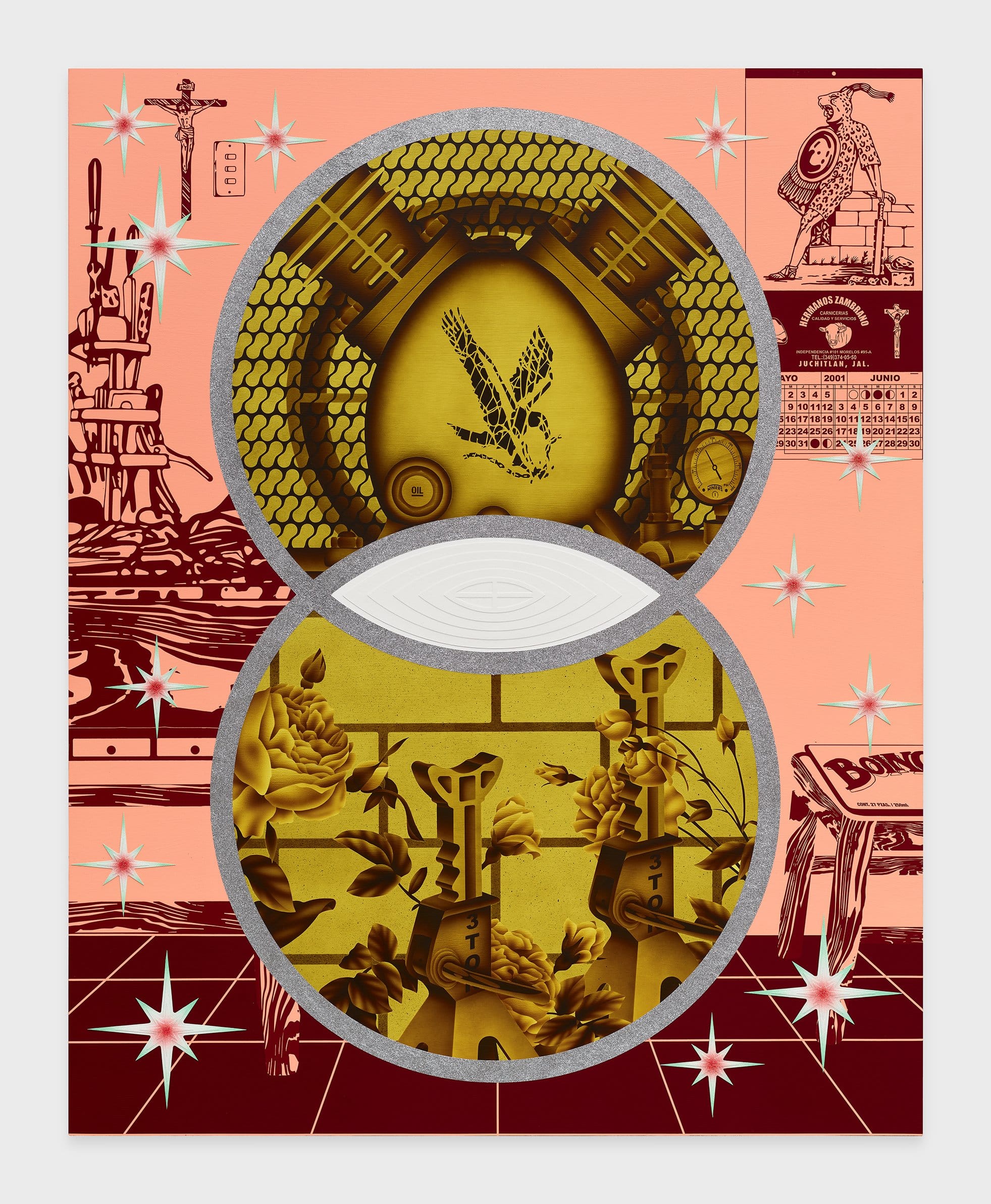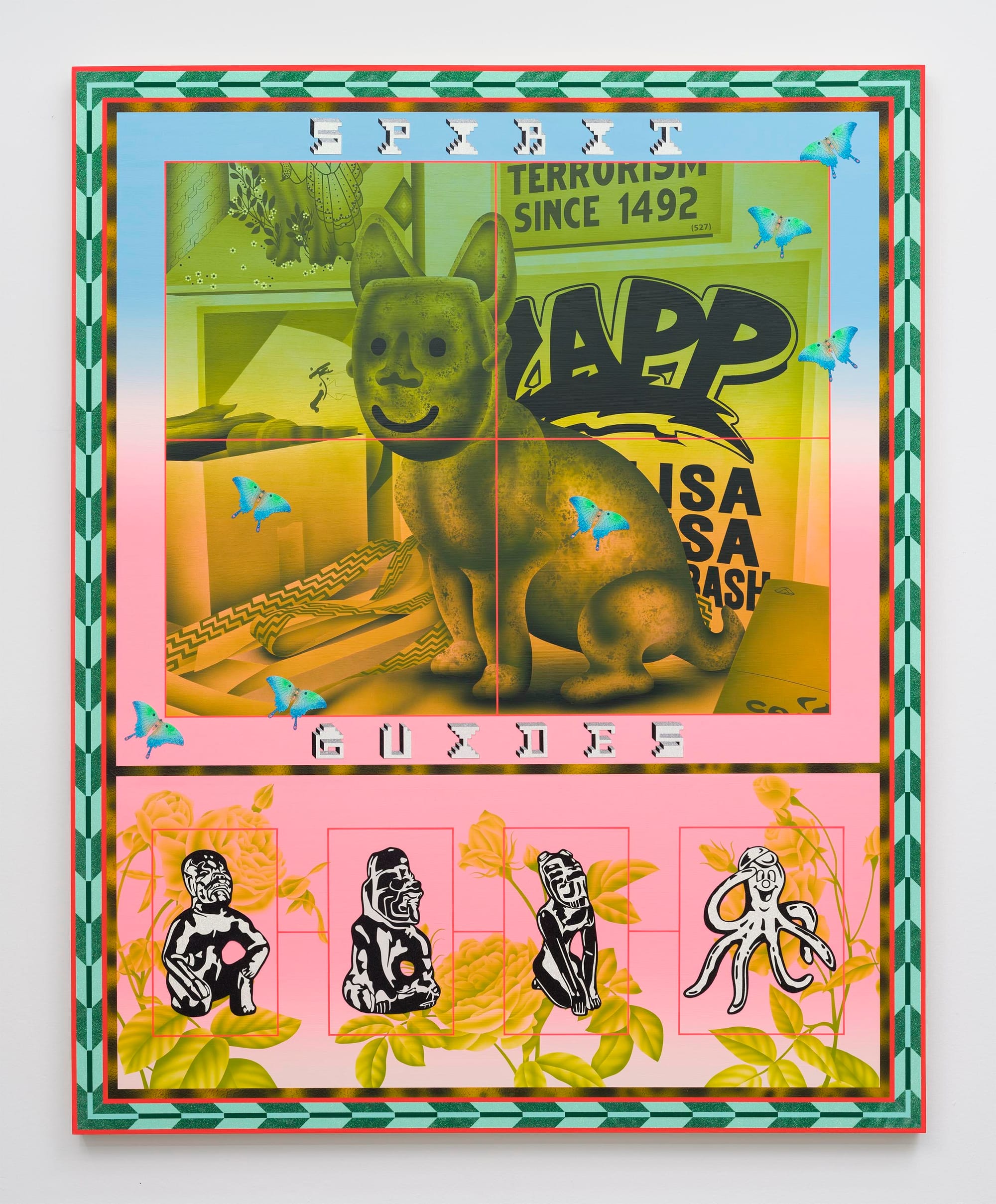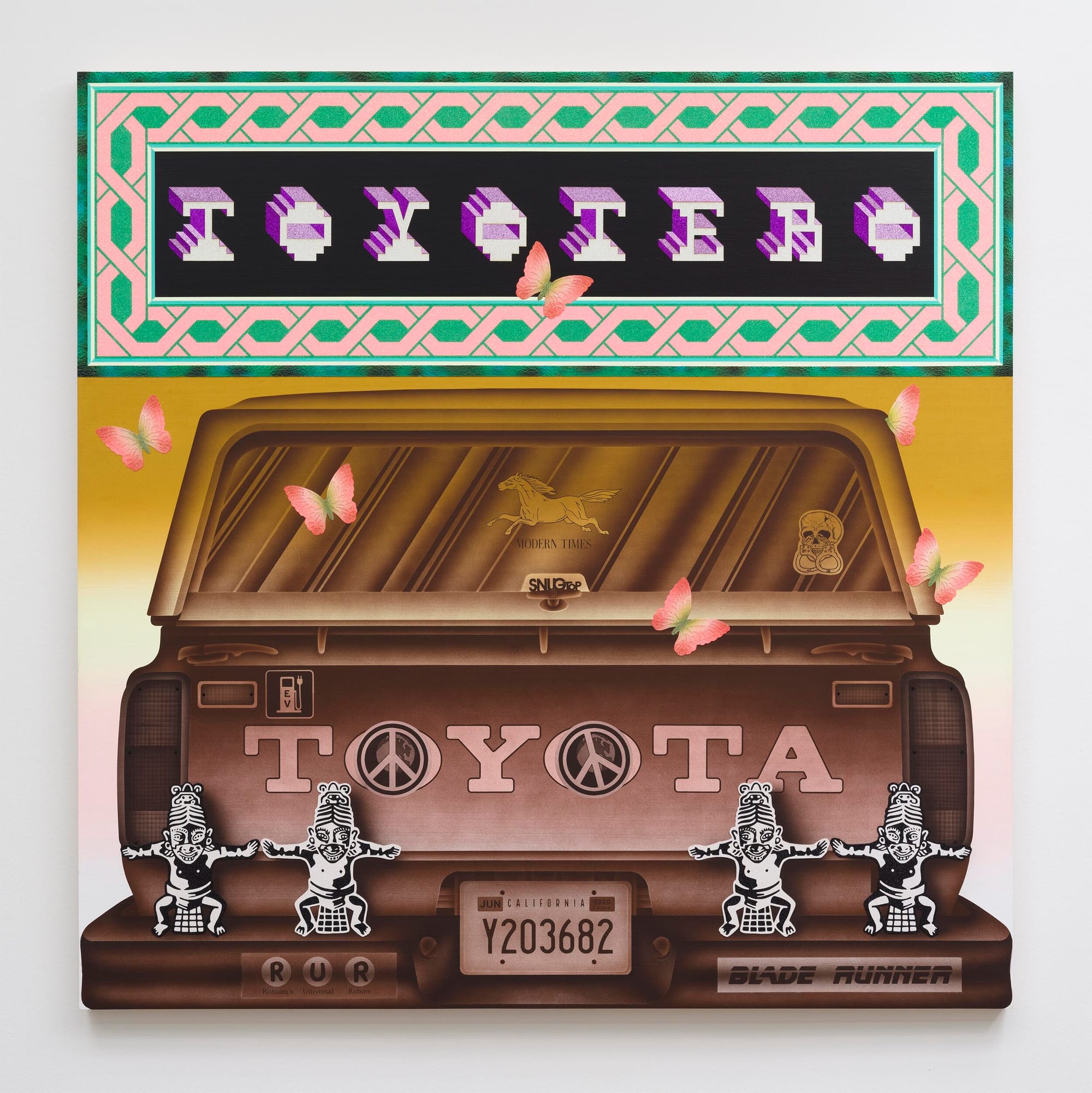 Wat een feestje, de werken van Jaime Muñoz. Schilderijen van een formaatje 2 bij 3 of 2 bij 2 en bijna een soort digitale tripjes, maar dan met de kwast en airbrushing.