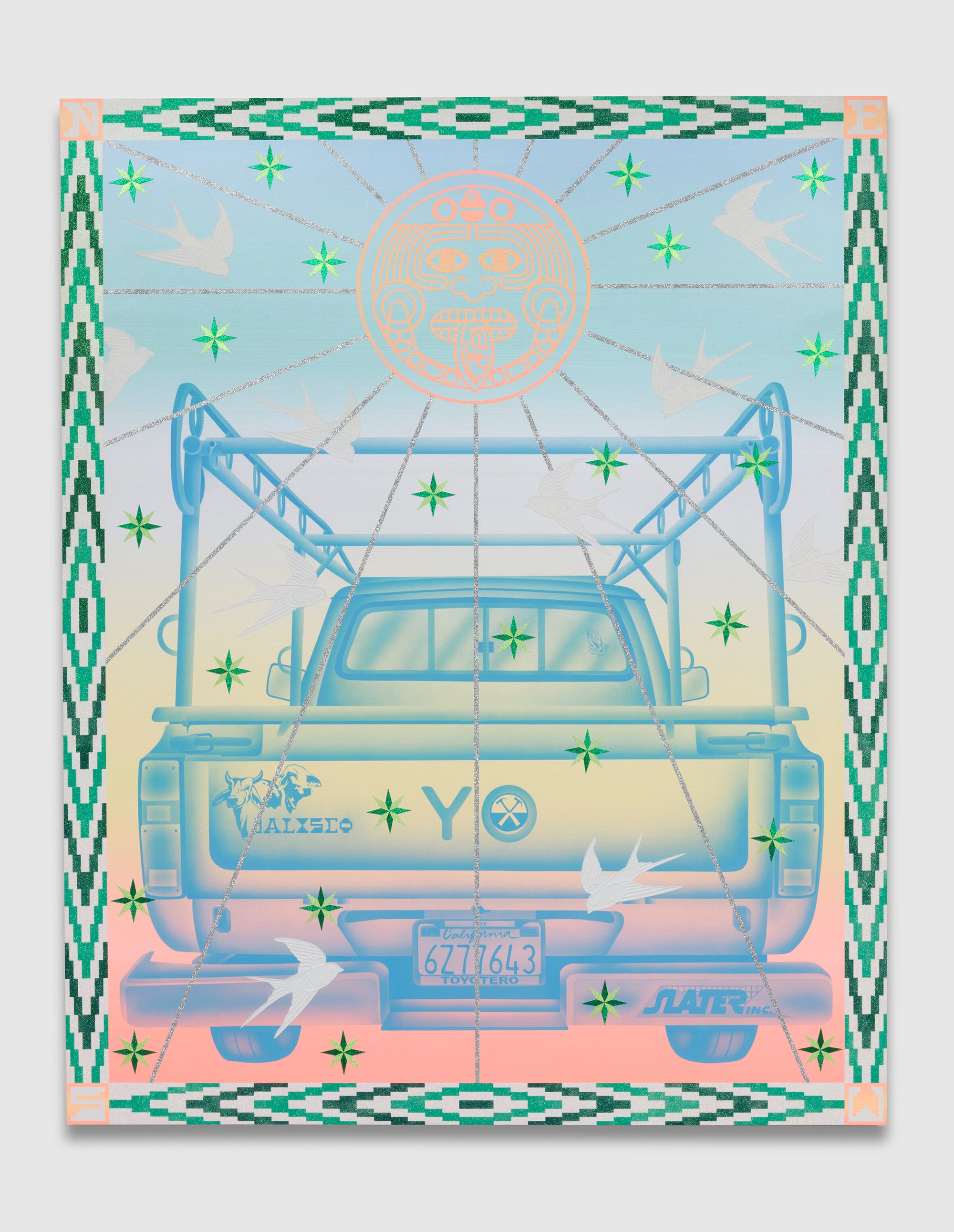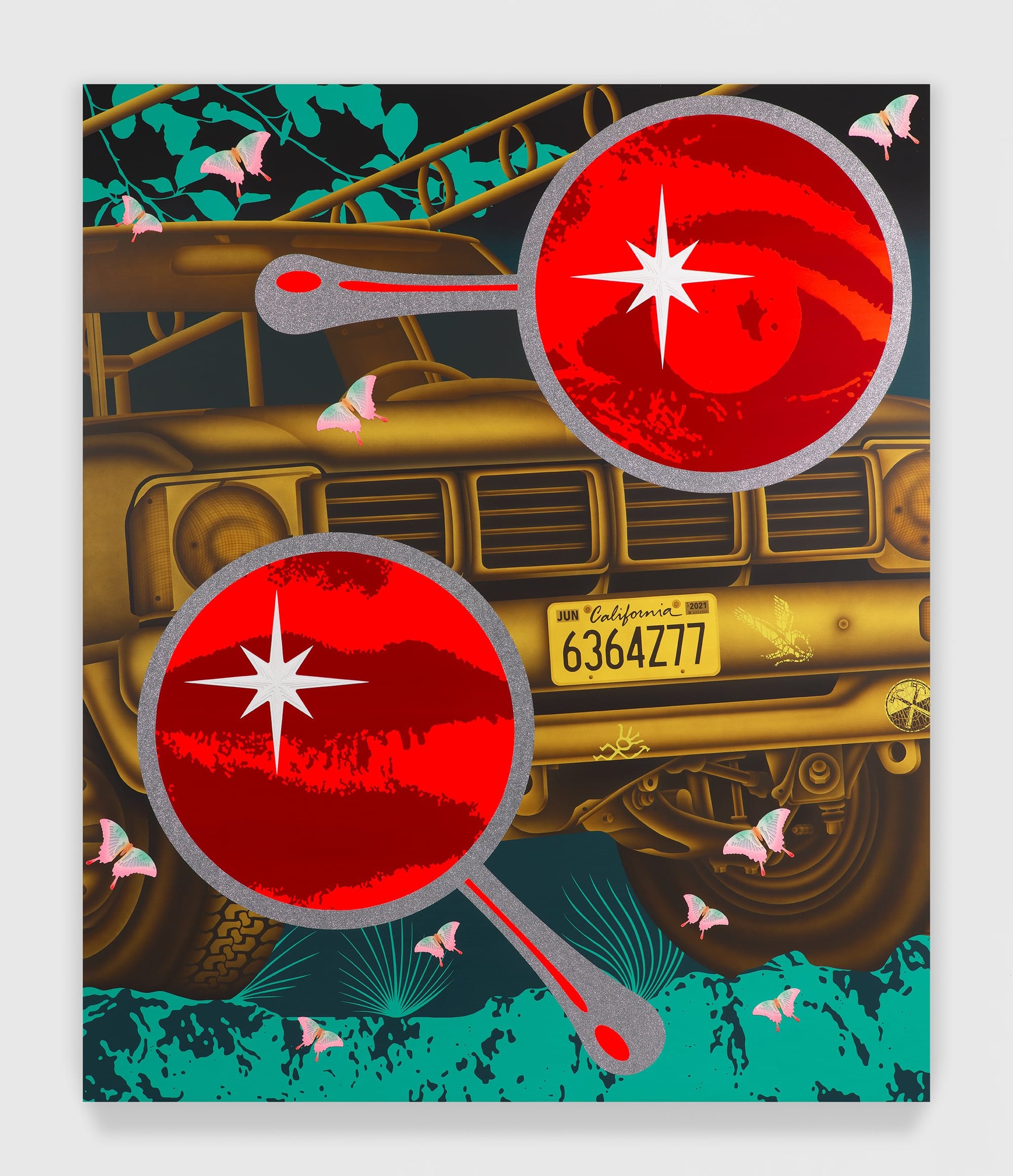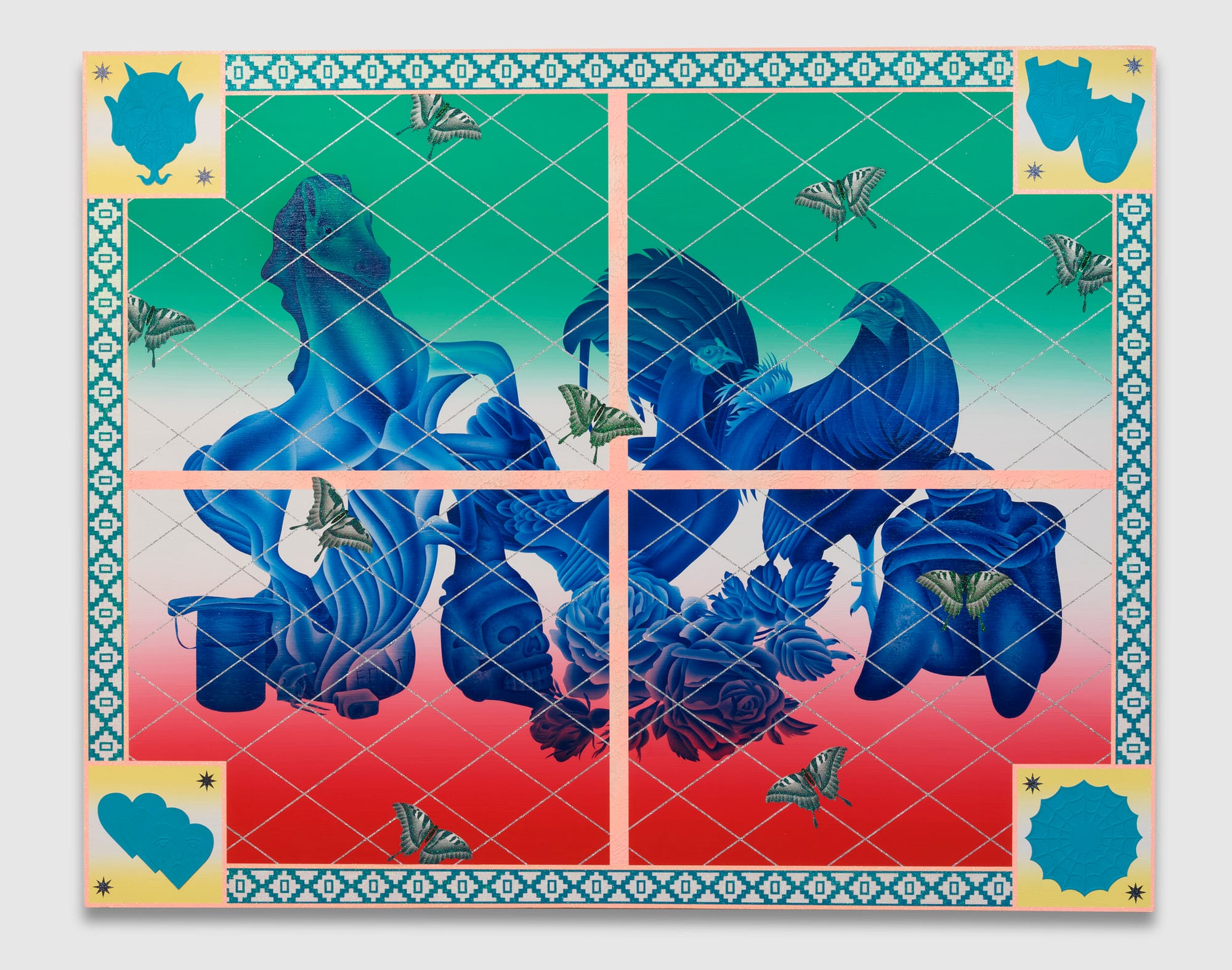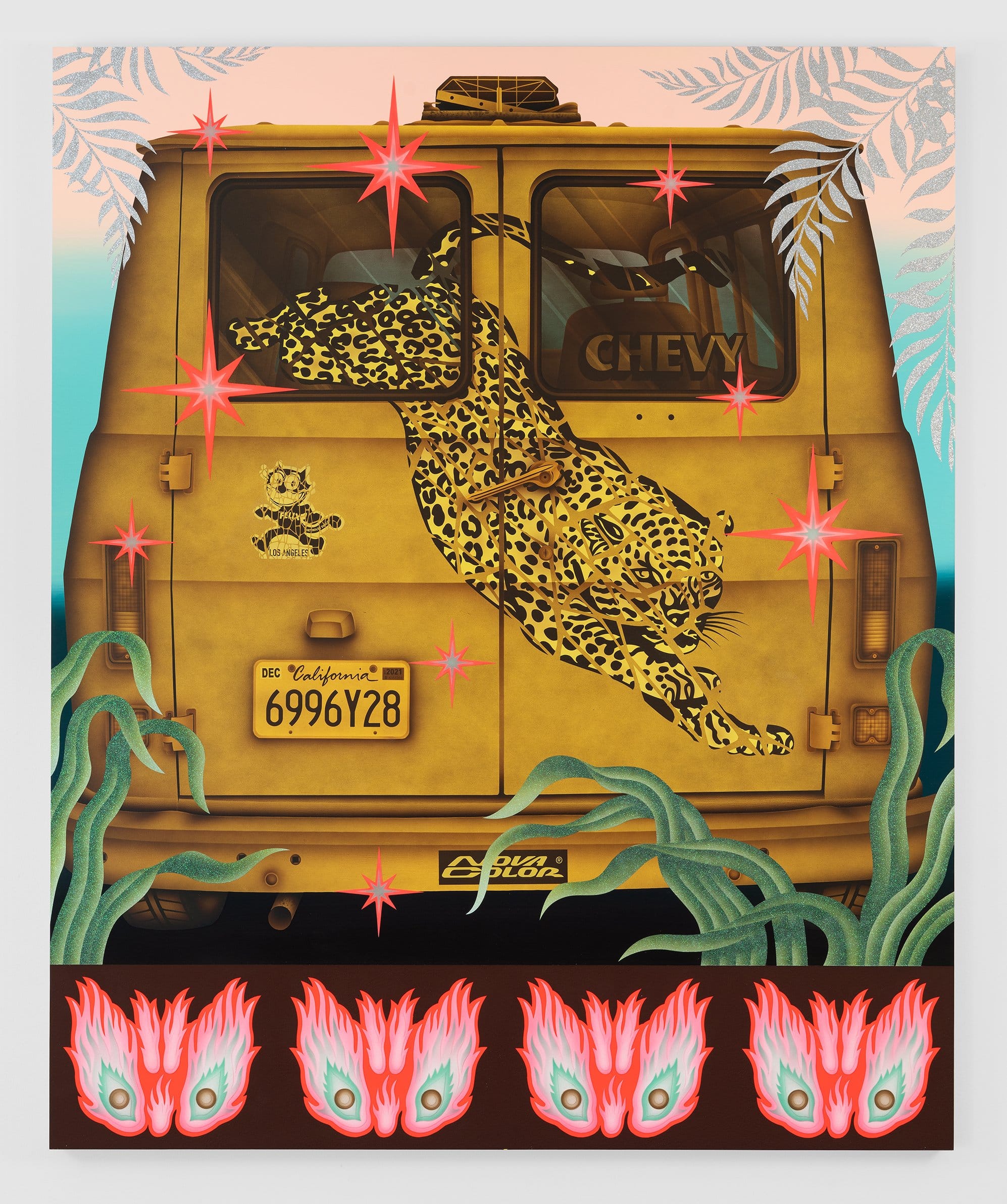 Wat een feestje, de werken van Jaime Muñoz. Schilderijen van een formaatje 2 bij 3 of 2 bij 2 en bijna een soort digitale tripjes, maar dan met de kwast en airbrushing.