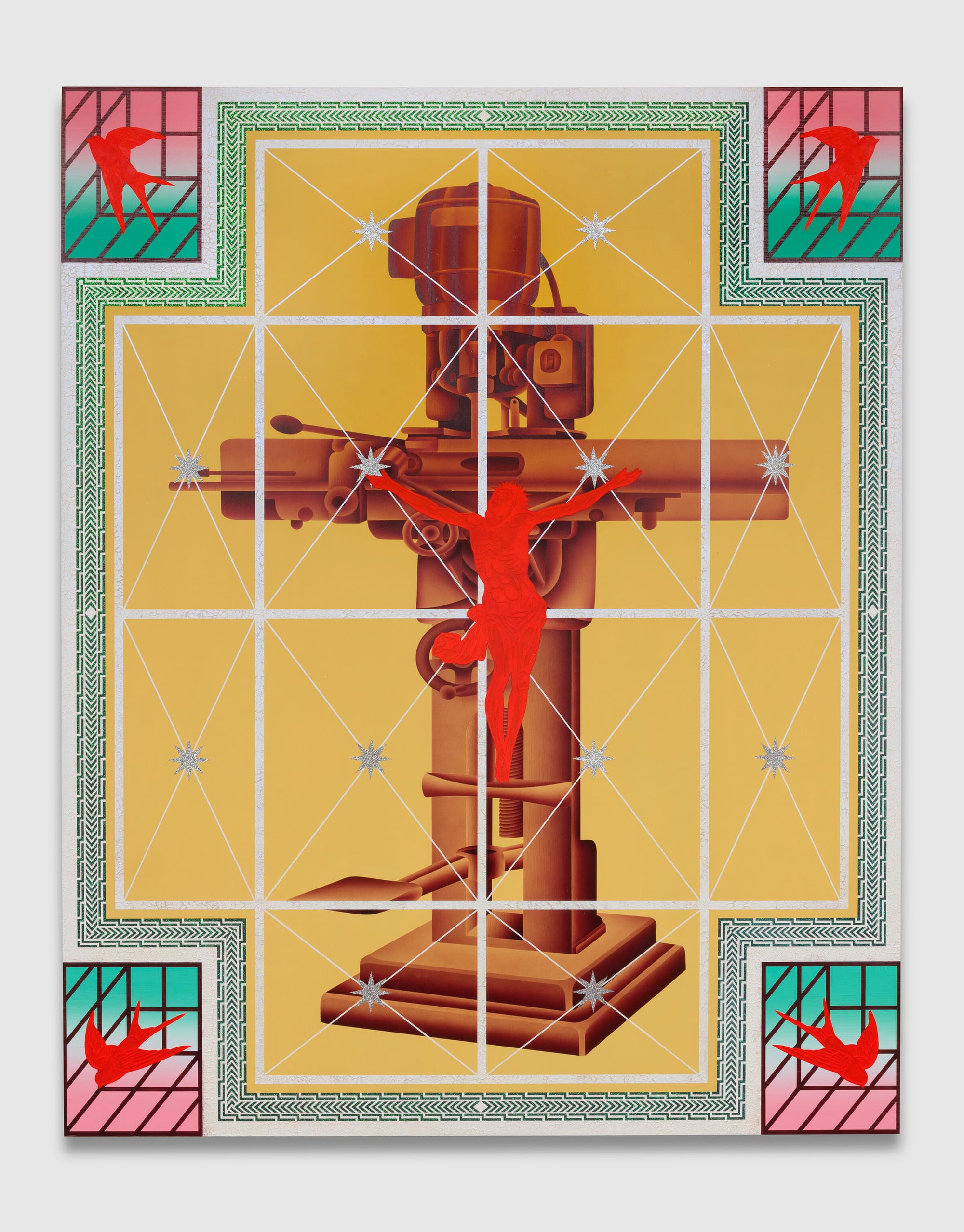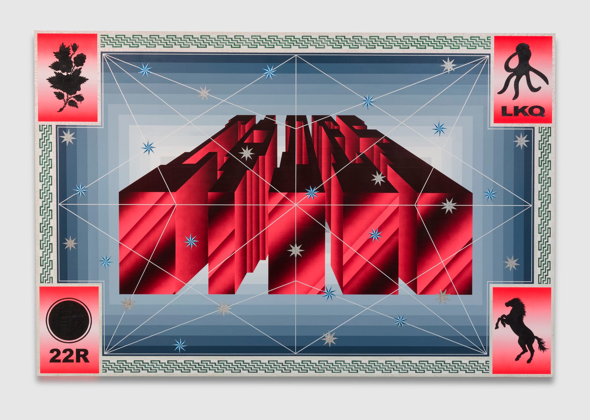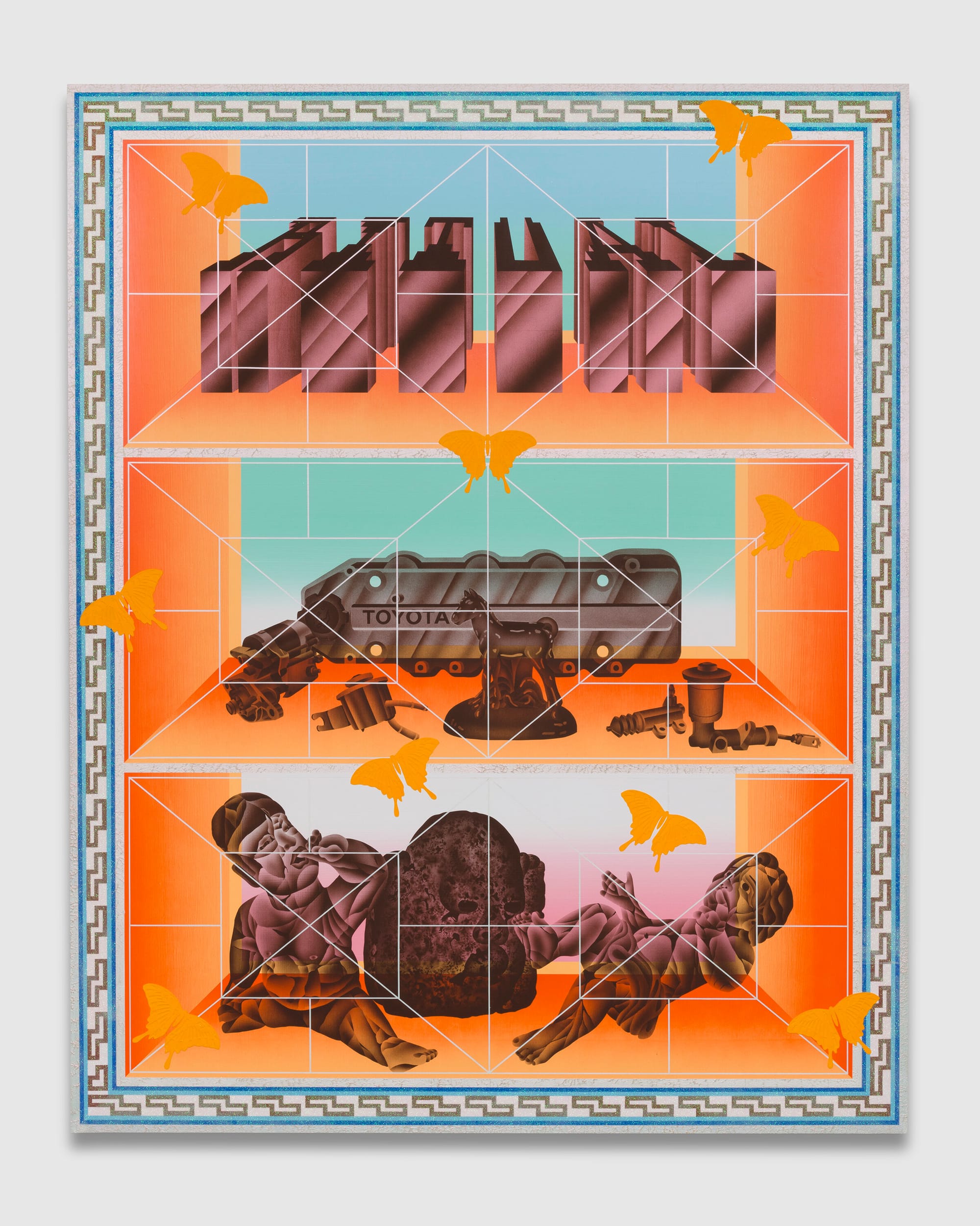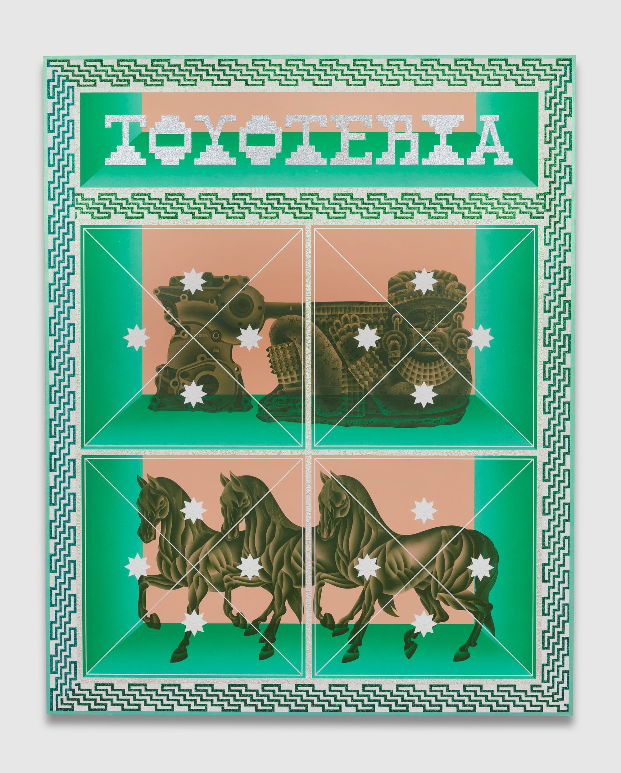 Wat een feestje, de werken van Jaime Muñoz. Schilderijen van een formaatje 2 bij 3 of 2 bij 2 en bijna een soort digitale tripjes, maar dan met de kwast en airbrushing.
