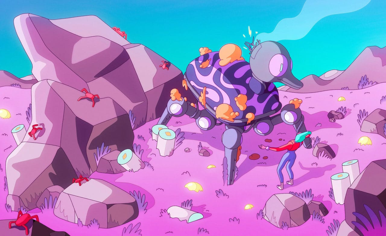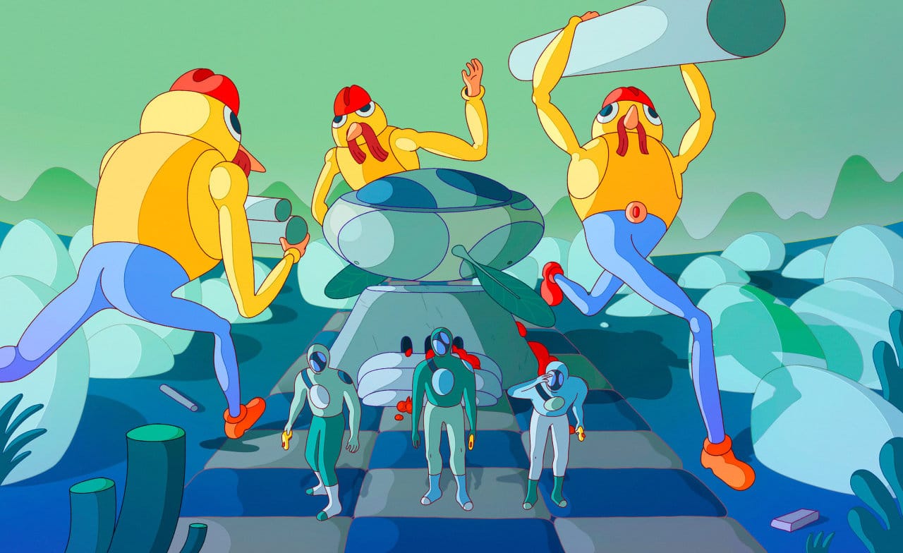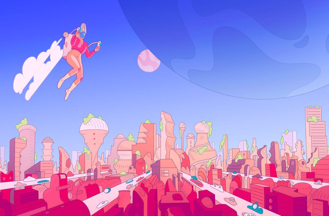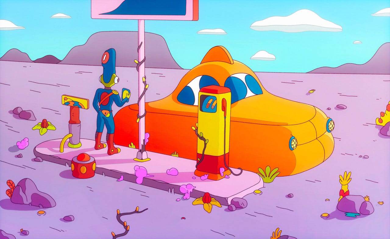 Geen idee hoe ik het werk moet omschrijven, maar ik weet wel dat ik er enorm vrolijk van word. Een soort dromerige, futuristische tekenstijl met vooral veel knallende kleurtjes.