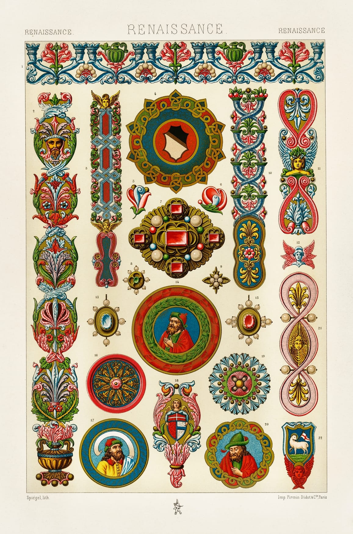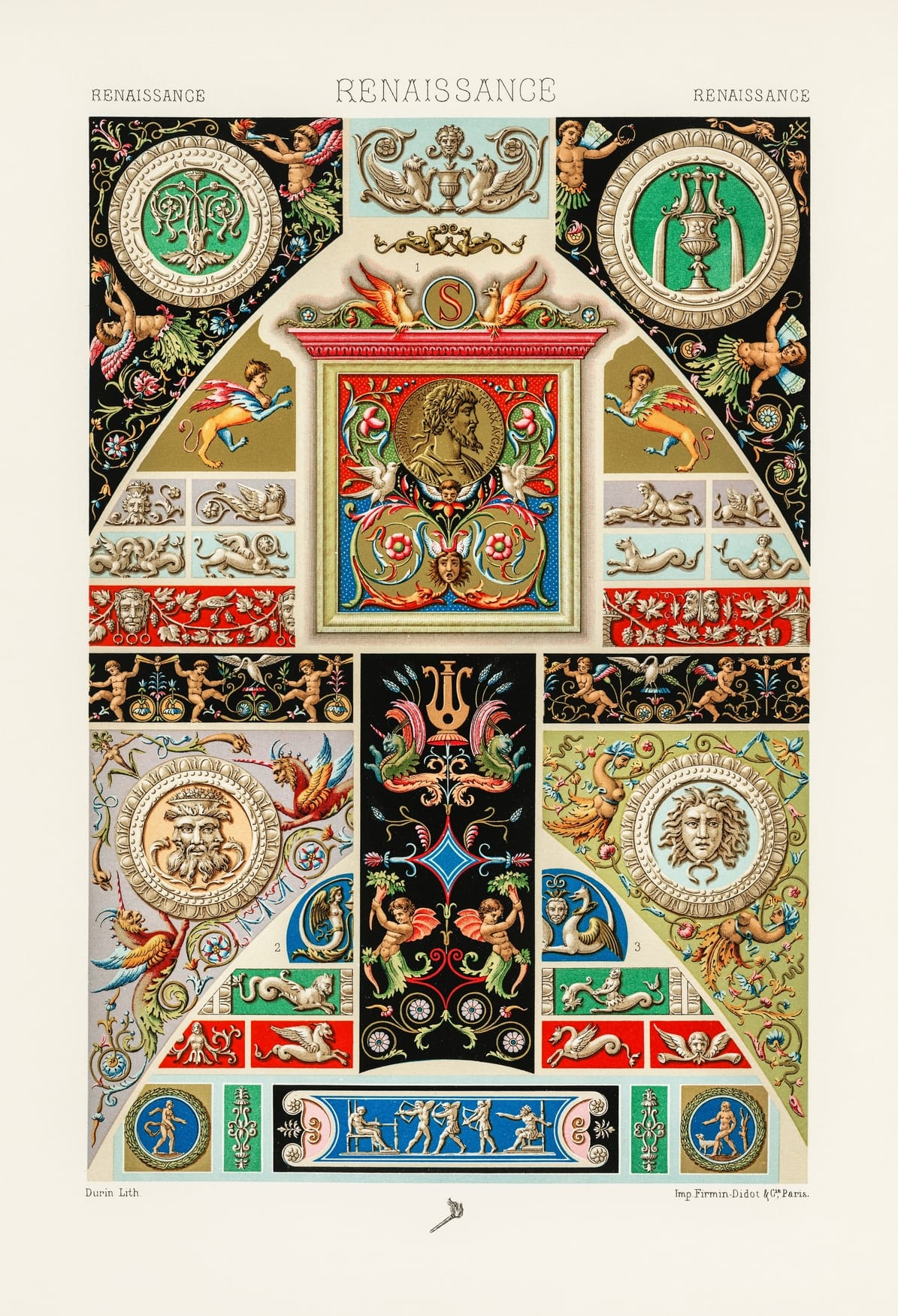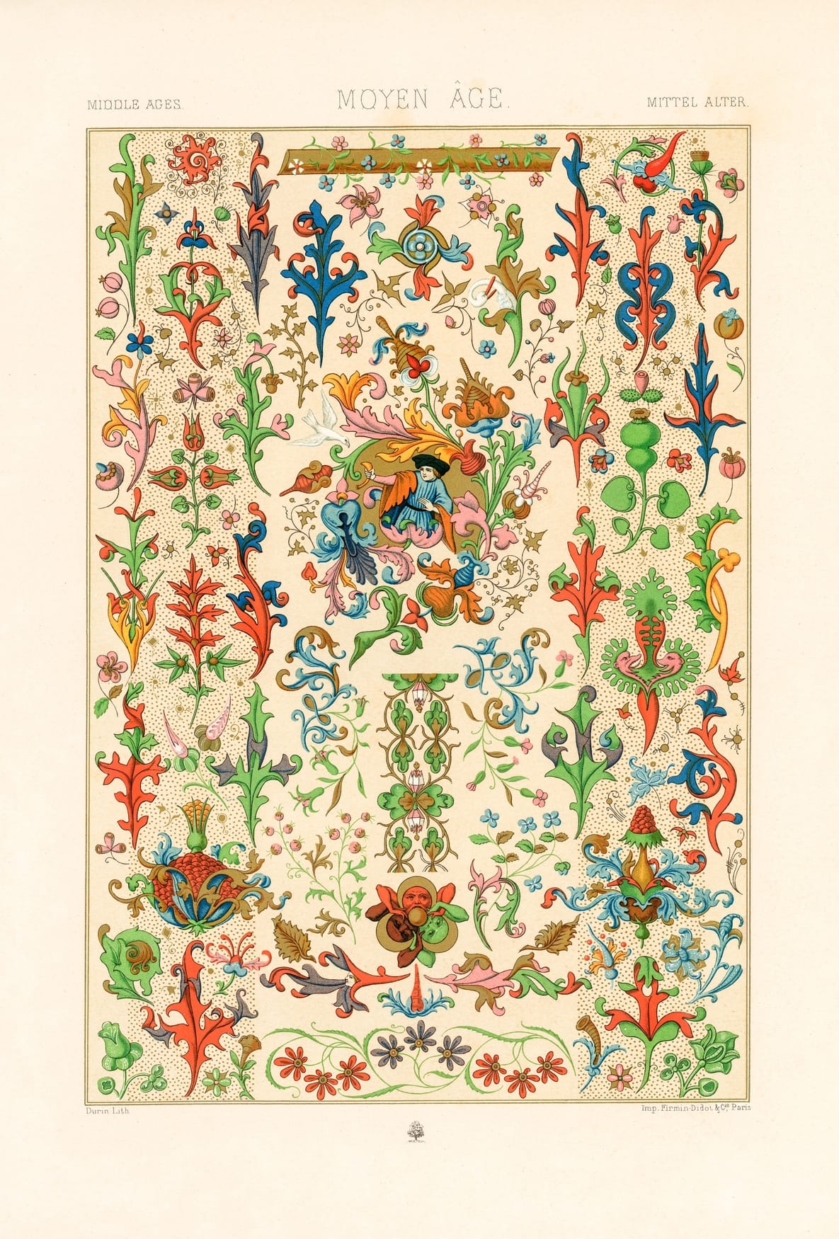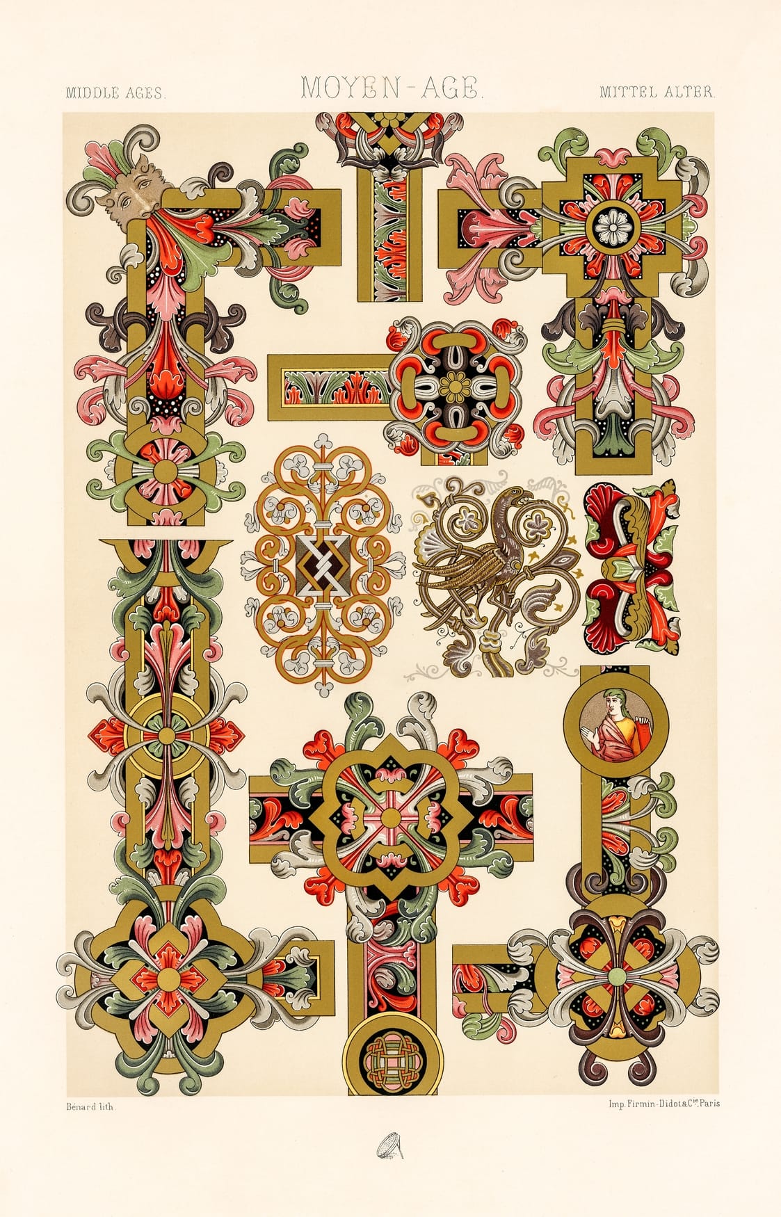 Ruim een decennium na Owen James’ Grammer of Ornament maakte ook Albert-Charles-Auguste Racine tussen 1869 en 1873 tien overzichtswerken van de geschiedenis van design. Van het oude Egypte naar het verre Oosten en van de Romeinse tijd naar de Middeleeuwen; alles zat erin. En zo’n 150 jaar, vintage alert, later kun je er nog steeds digitaal van genieten bij de NYPL 👀