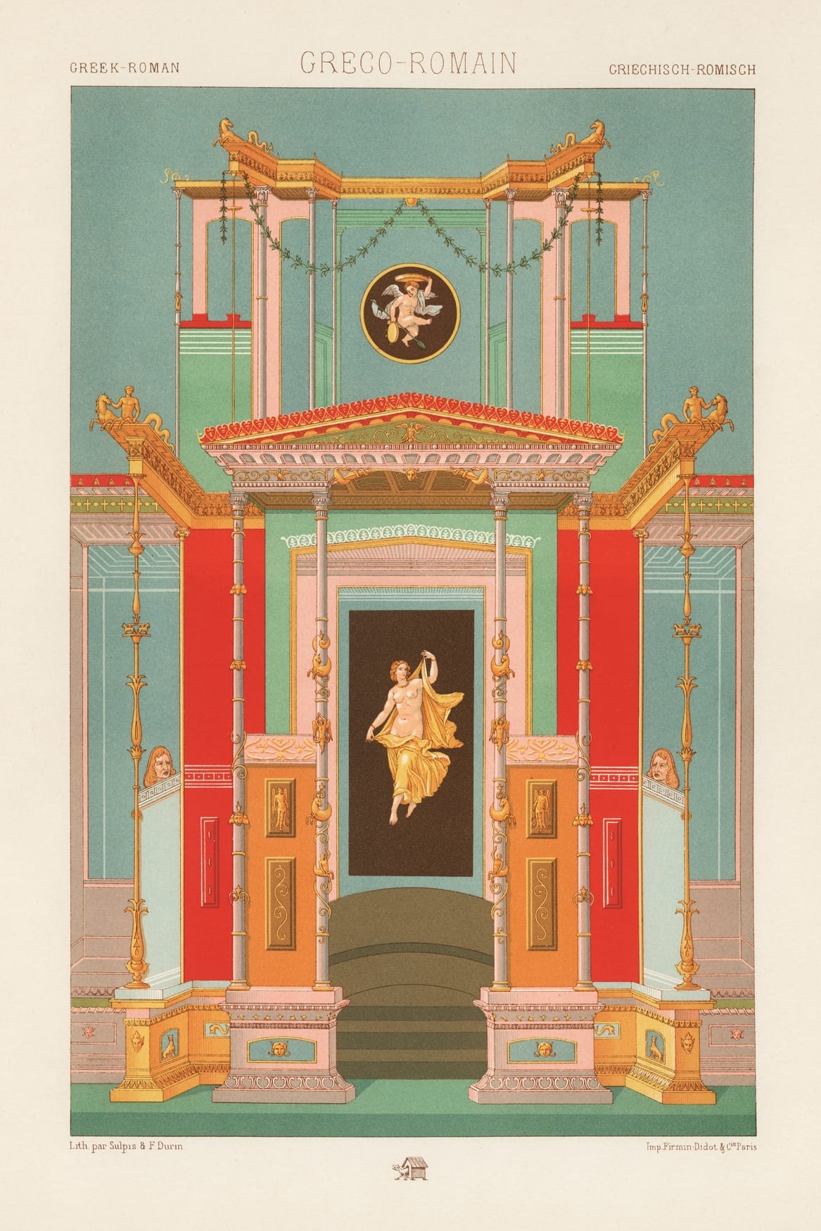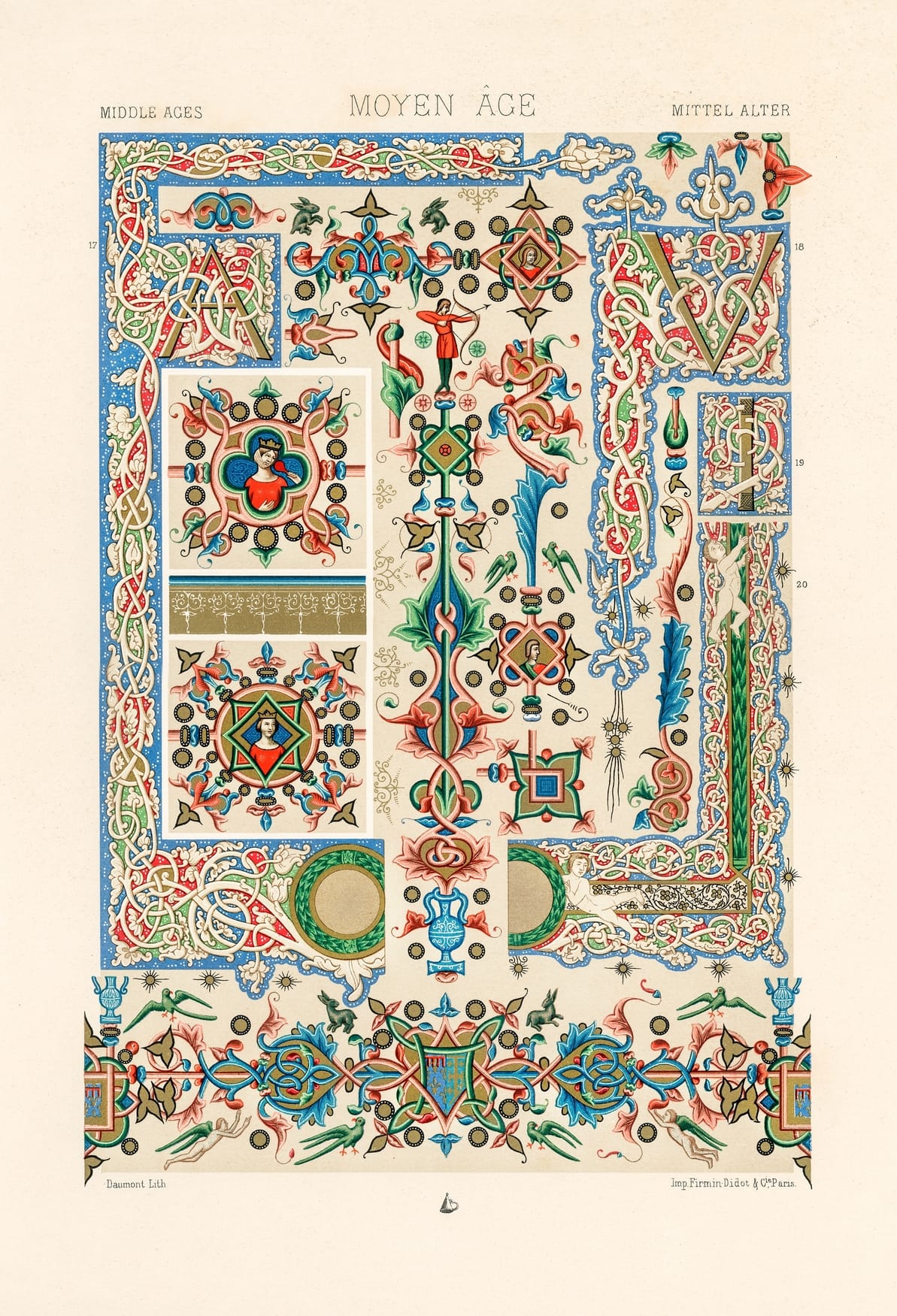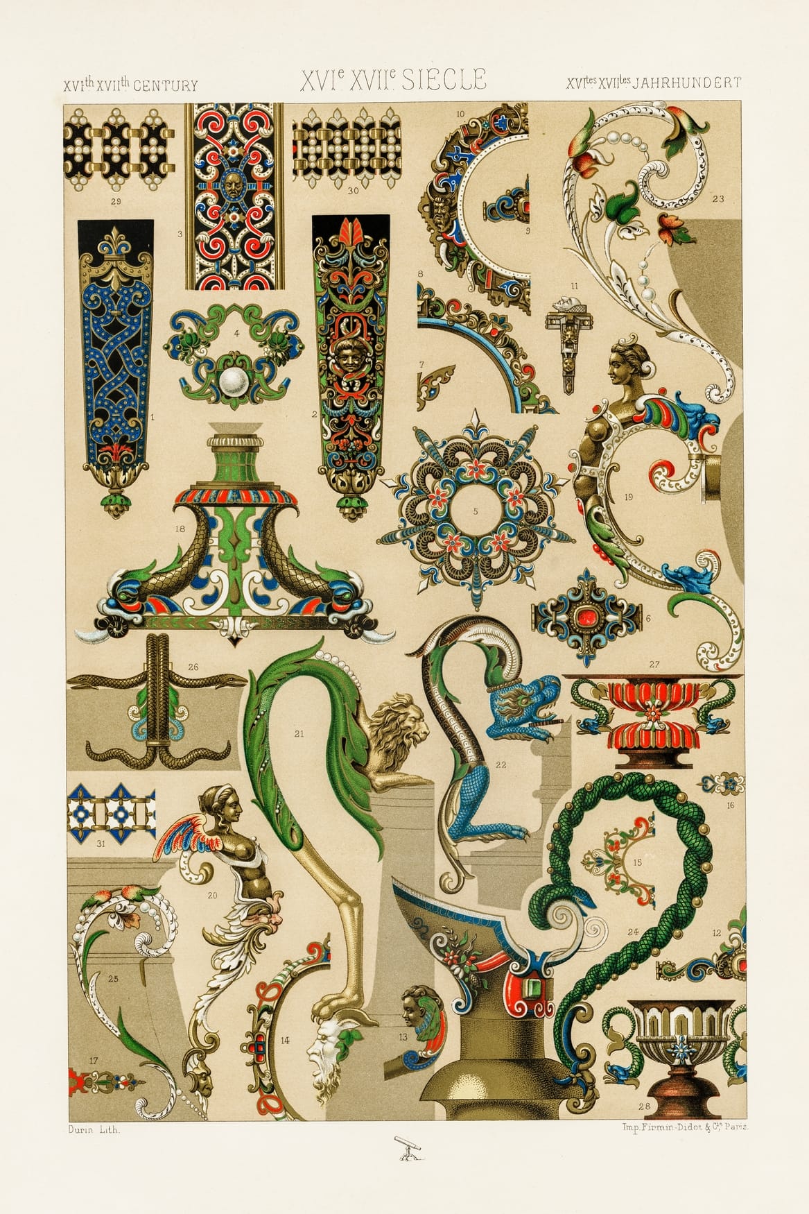 Ruim een decennium na Owen James’ Grammer of Ornament maakte ook Albert-Charles-Auguste Racine tussen 1869 en 1873 tien overzichtswerken van de geschiedenis van design. Van het oude Egypte naar het verre Oosten en van de Romeinse tijd naar de Middeleeuwen; alles zat erin. En zo’n 150 jaar, vintage alert, later kun je er nog steeds digitaal van genieten bij de NYPL 👀