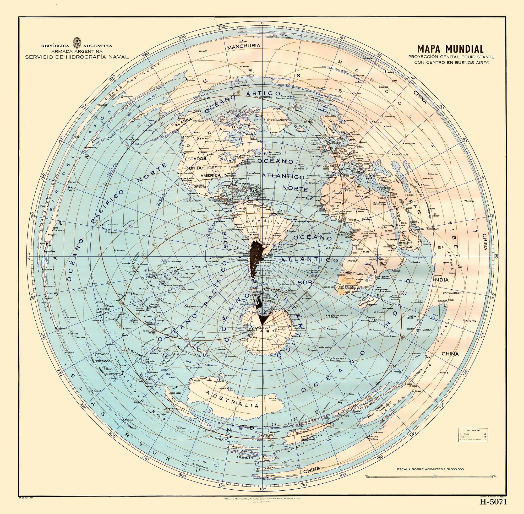 Het blijft fascinerend hoe kaarten je blik op de wereld bepalen. En je dus ook meteen weer de weg kwijt bent als het even niet is zoals je gewend bent. Drie keer met je ogen knijpen toen ik deze 'Mapa Mundial' tegenkwam uit 1975 met Argentinië als middelpunt.