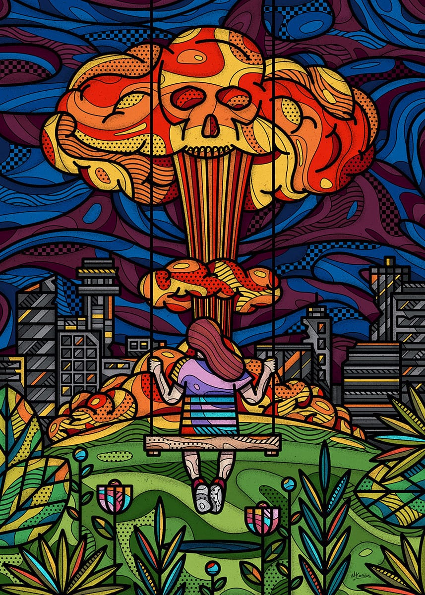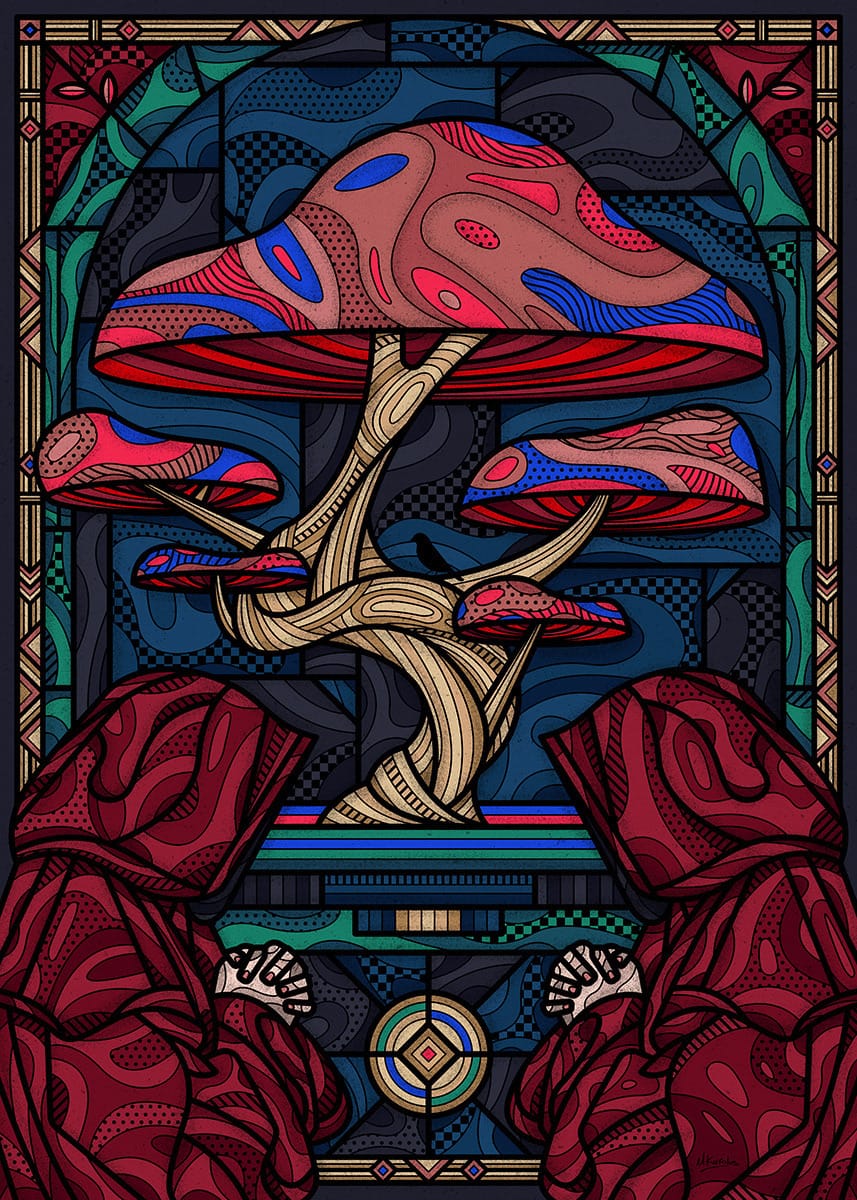 Een soort glas-in-lood-stijl illustraties die gewoon heel lekker in het oog liggen. Zo op de veel te vroege zaterdagochtend, want waarom ben ik wakker?