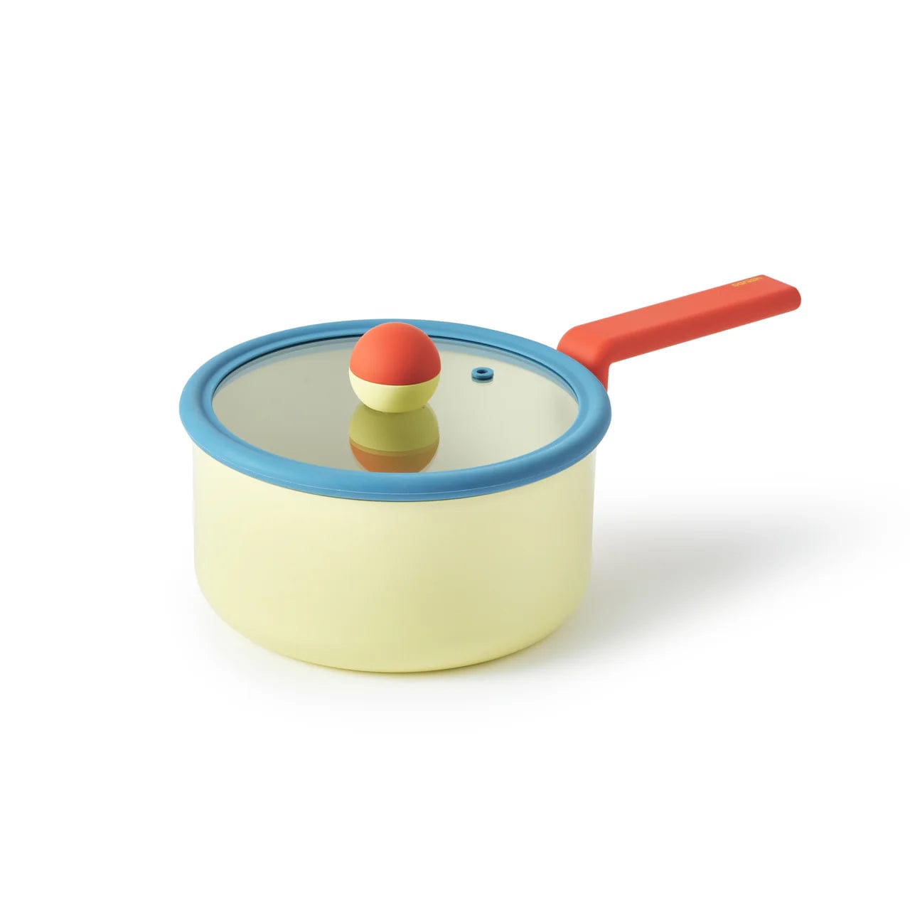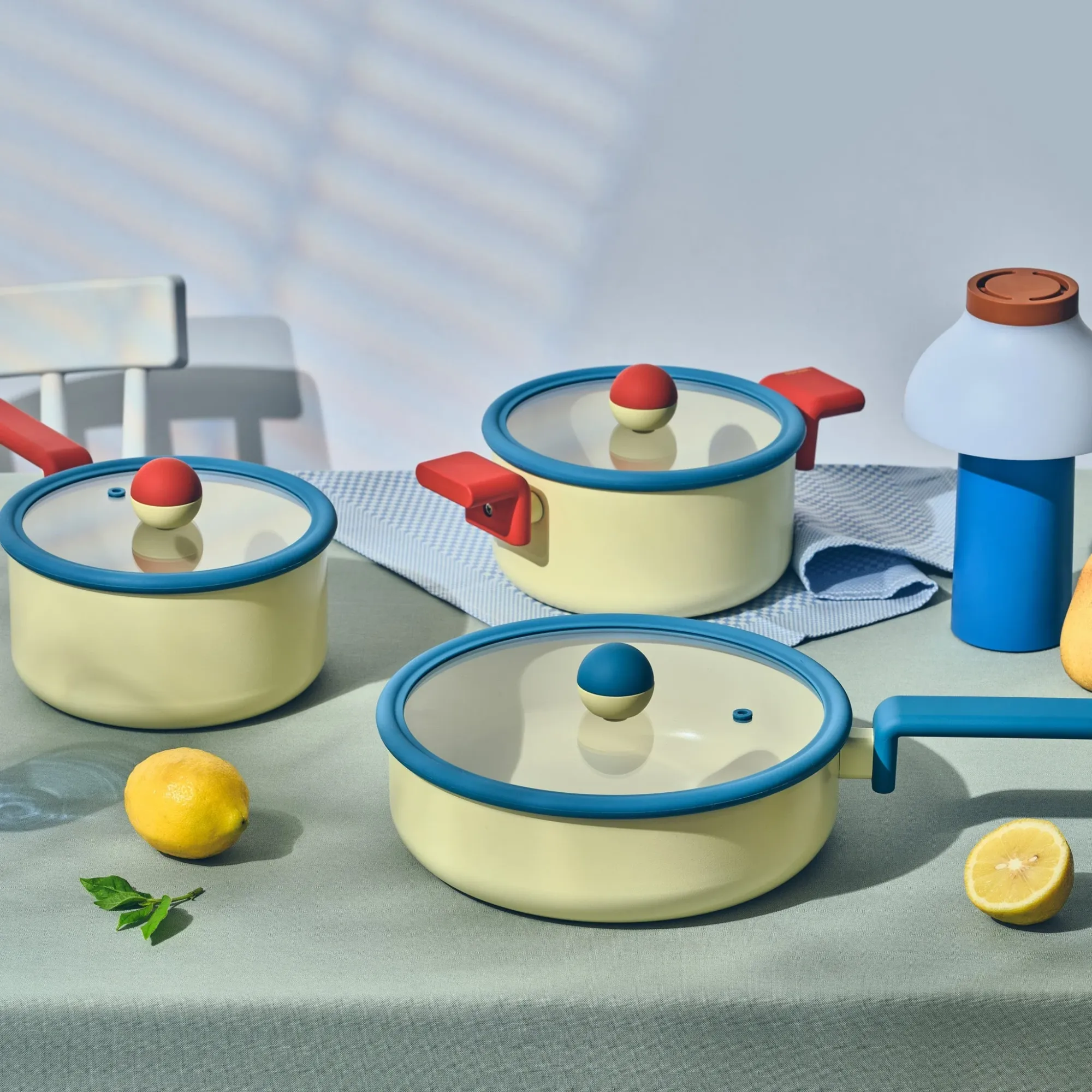 Nee, geen AI, maar dit zijn dus gewoon echte pannetjes. Van Neoflam. Lekker retro, maar dan in een modern jasje.