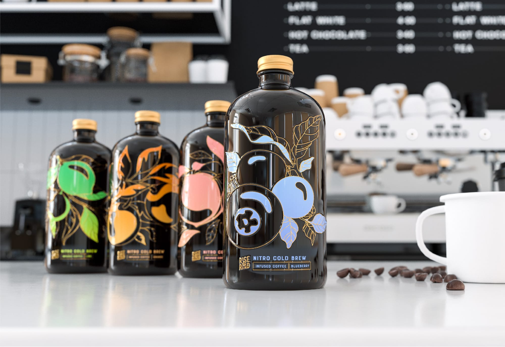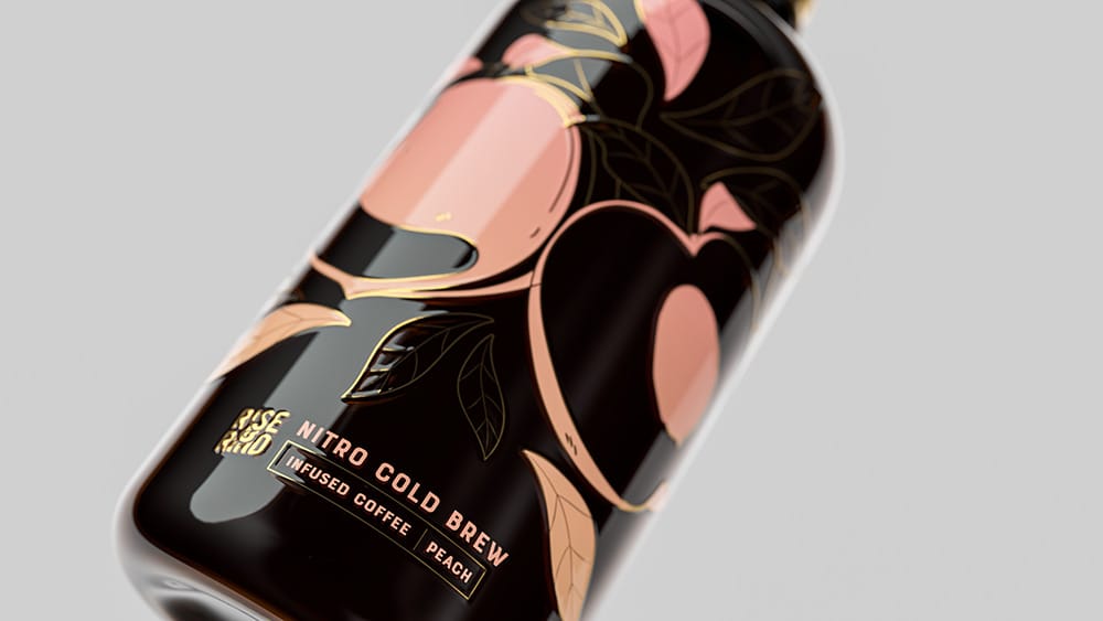 JXL voor een infused koffie brew. Straffe illustraties, goed palet en mooi verwerkt over de fles, embossed en alles.