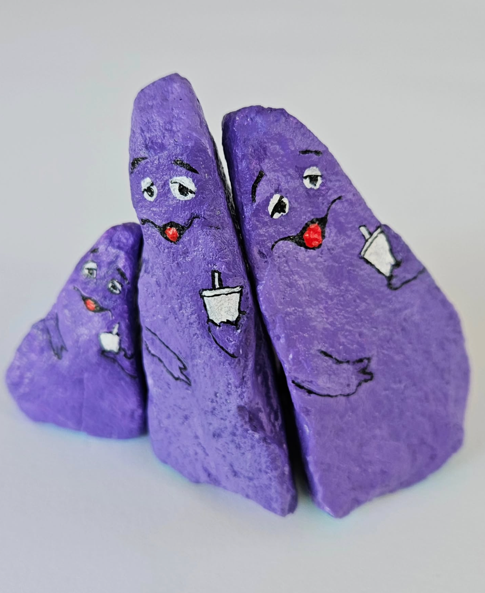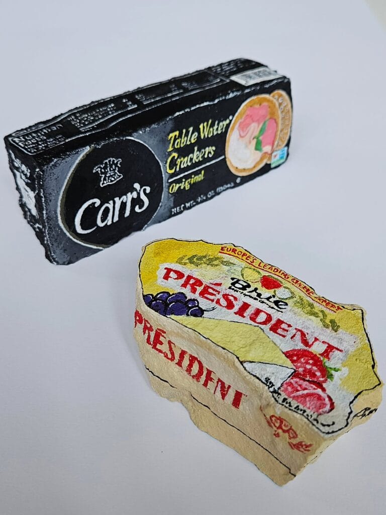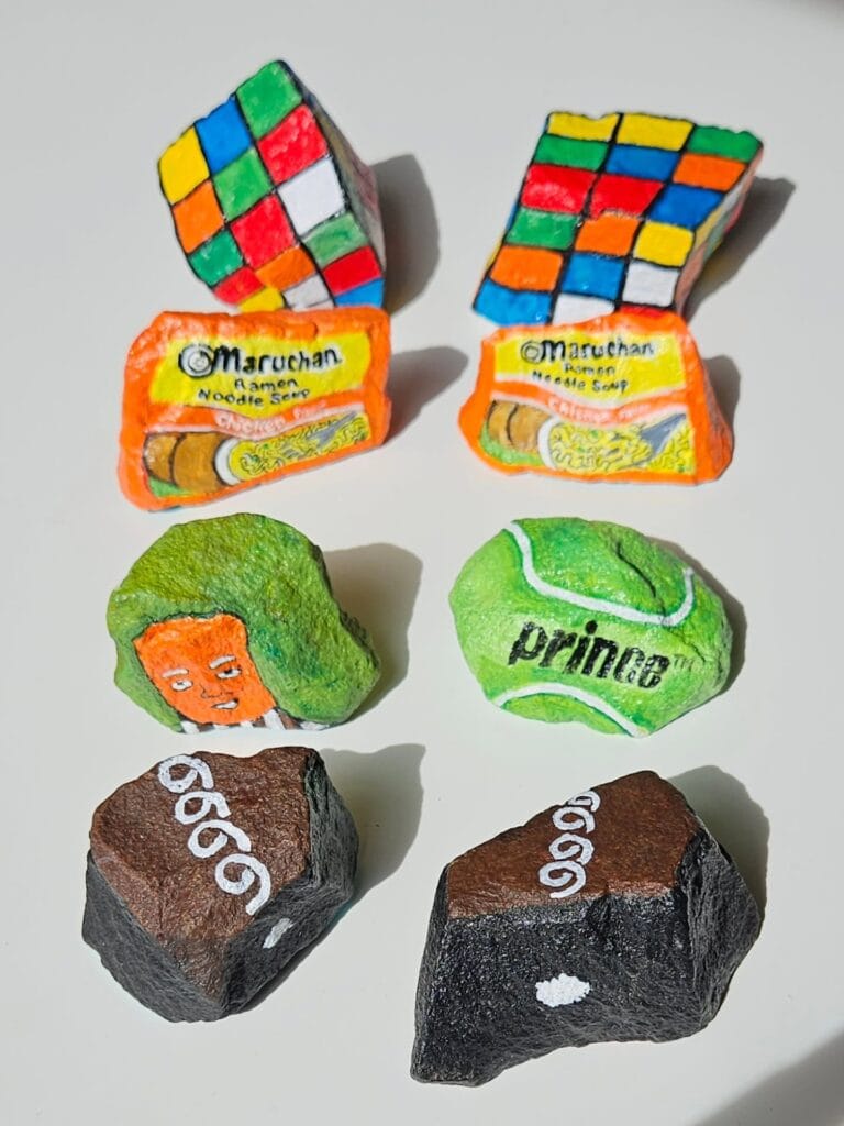 Nee, alleen maar stenen, maar dan wel kunst. Betty Rubble, goede naam toch, beschildert stenen als bekende voorwerpen en… het werkt.