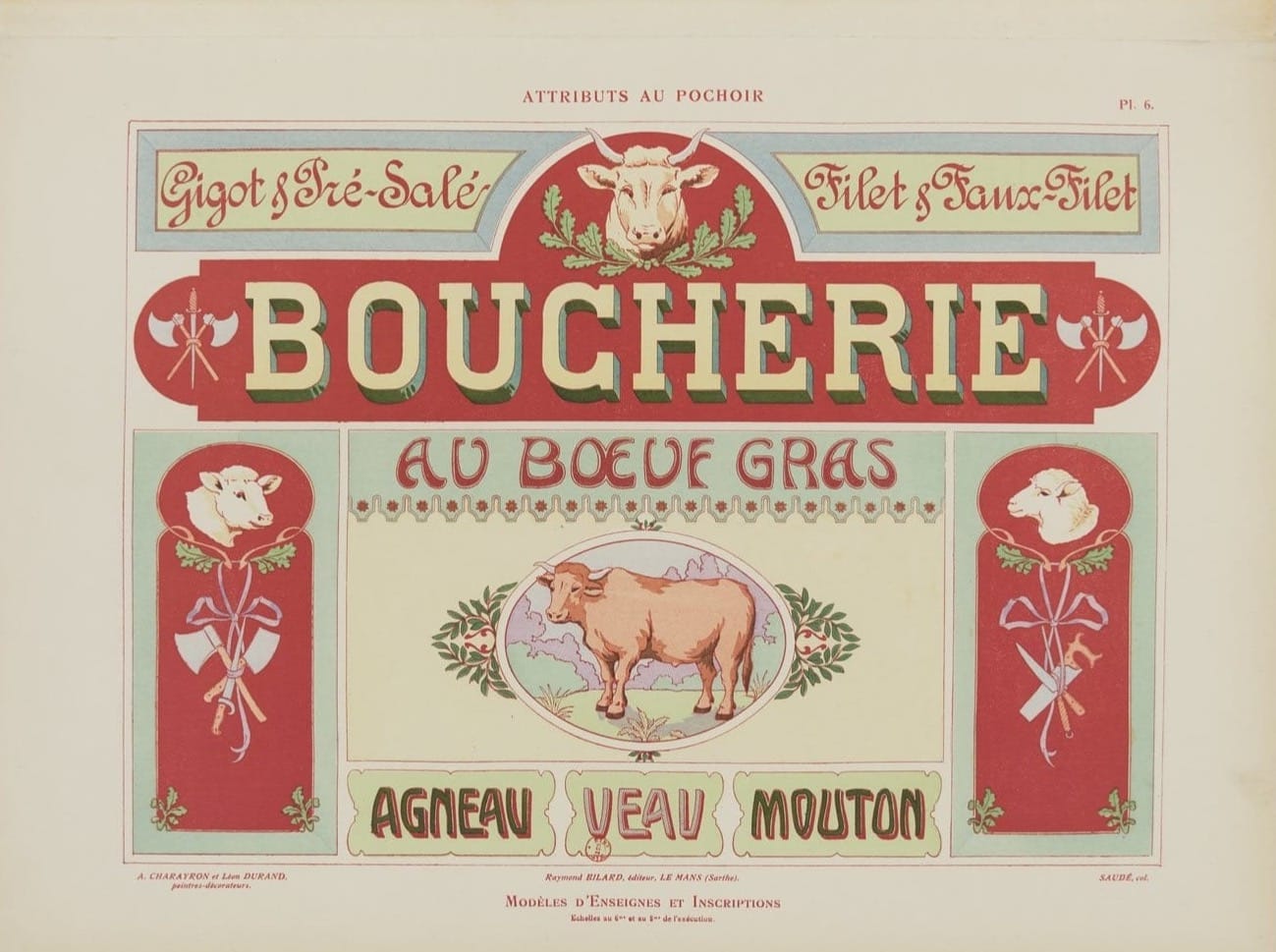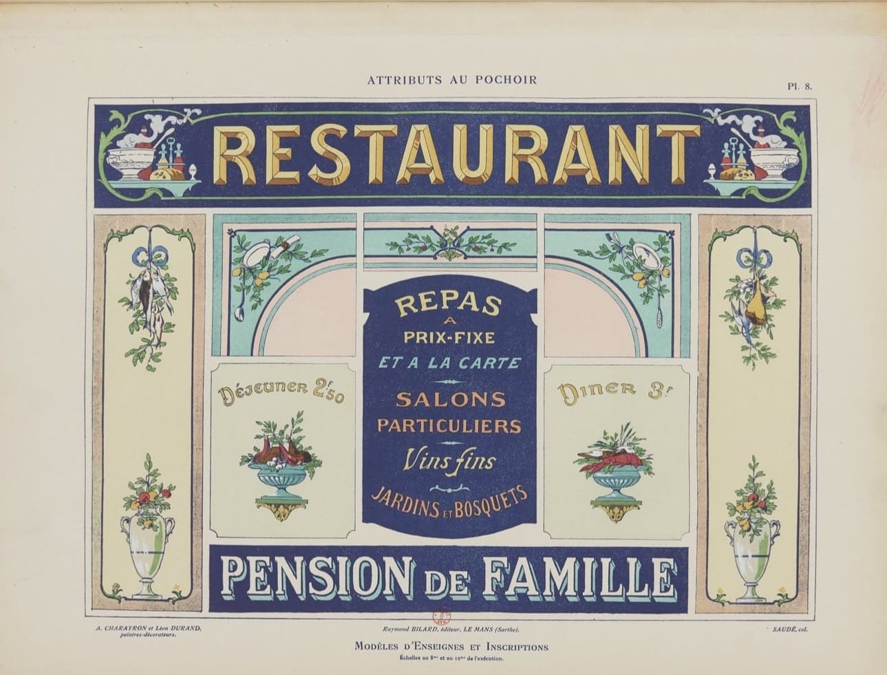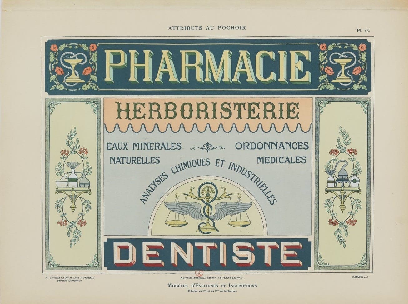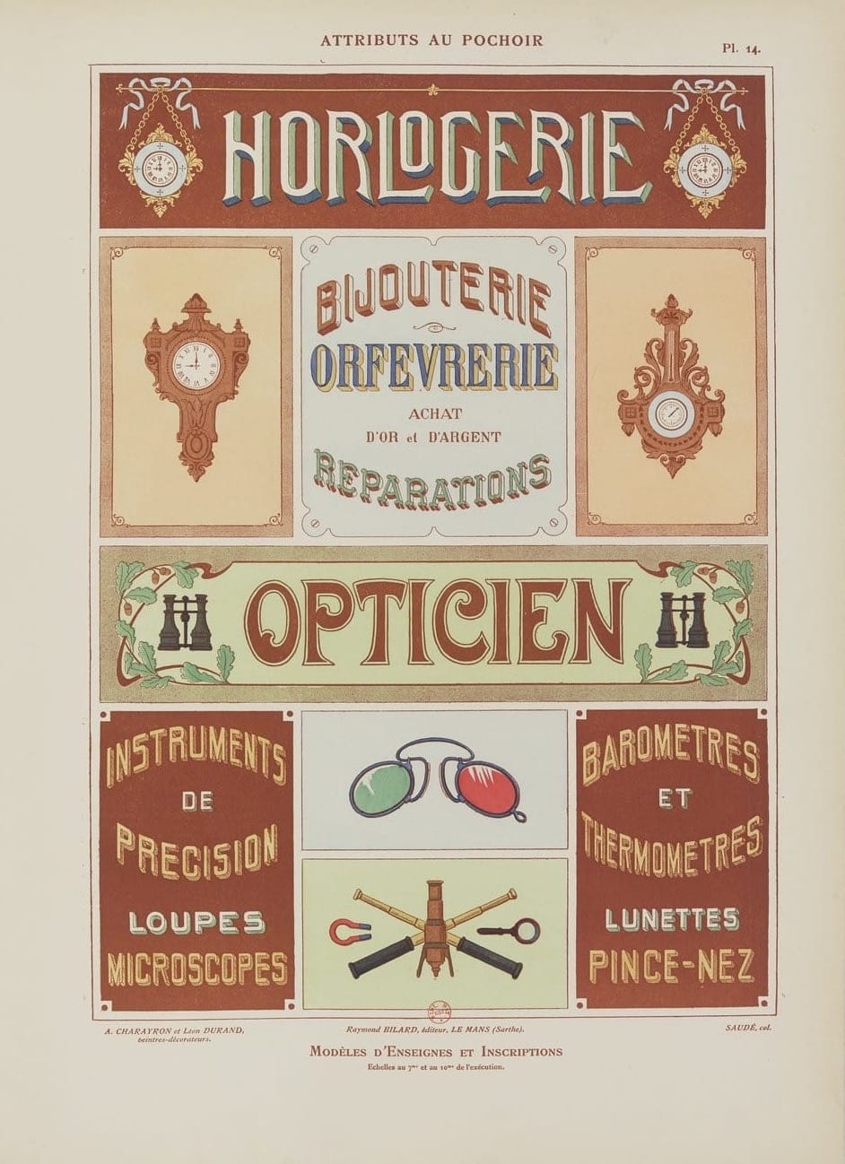 In 1914, net voordat de wereld vlam vatte, brachten twee Franse schilders – Charayron en Durand – een boekje uit dat voelt als een grafische snoepwinkel: Attributs au pochoir: Modèles d’enseignes et inscriptions. Een catalogus vol sjabloonontwerpen voor gevelborden, gemaakt voor o.a. bakkers, apothekers, slagers en meer, die begrepen dat goede typografie klanten trekt.