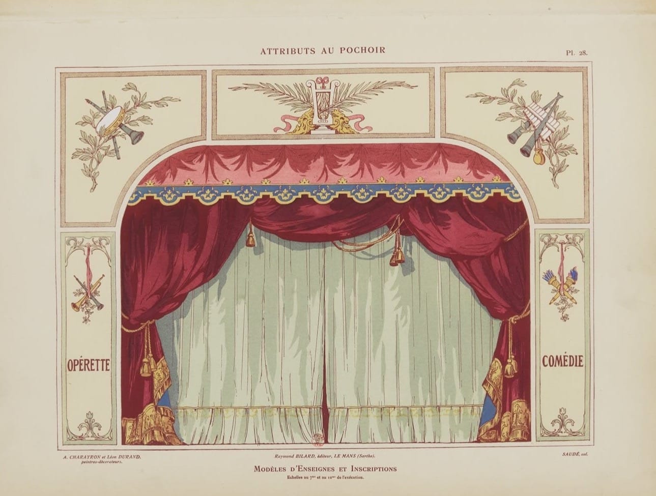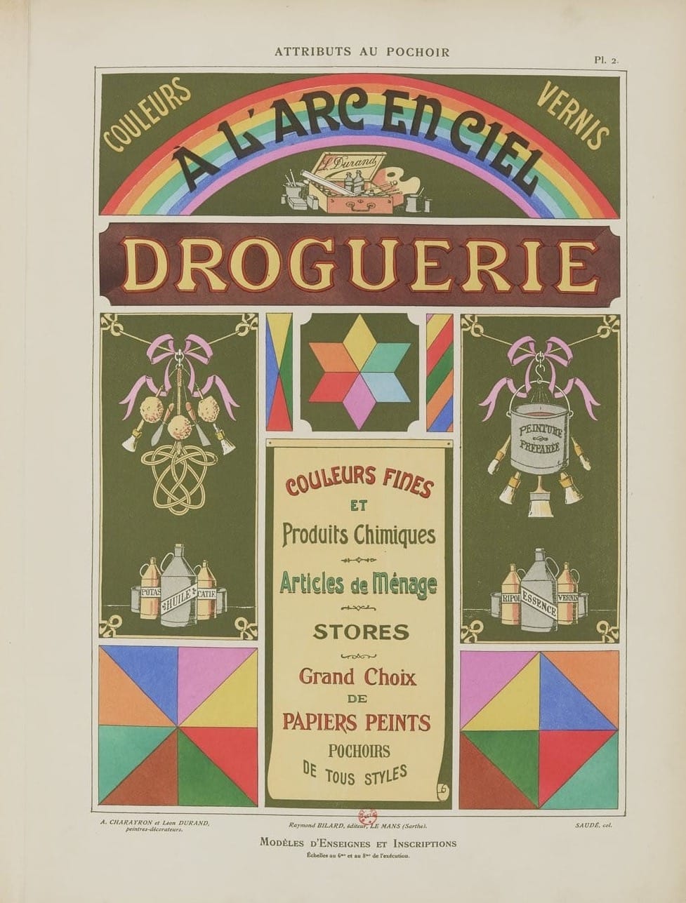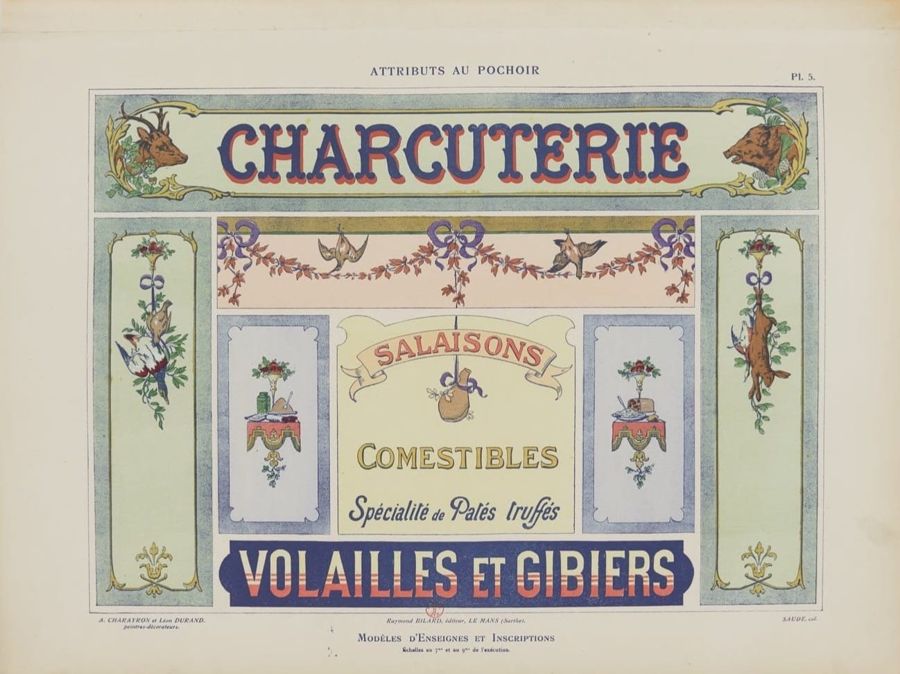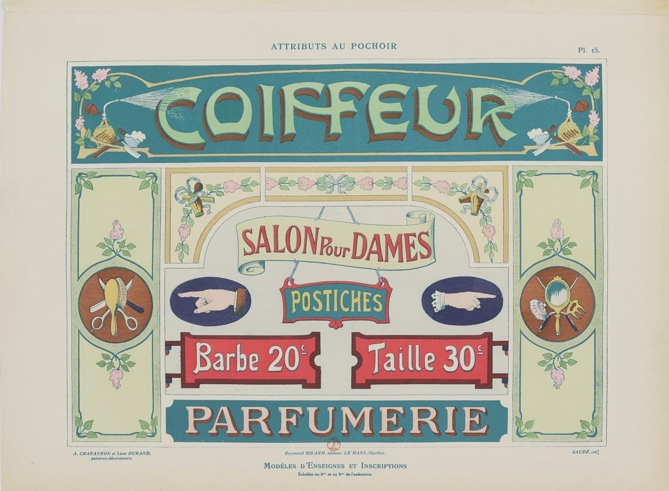 In 1914, net voordat de wereld vlam vatte, brachten twee Franse schilders – Charayron en Durand – een boekje uit dat voelt als een grafische snoepwinkel: Attributs au pochoir: Modèles d’enseignes et inscriptions. Een catalogus vol sjabloonontwerpen voor gevelborden, gemaakt voor o.a. bakkers, apothekers, slagers en meer, die begrepen dat goede typografie klanten trekt.
