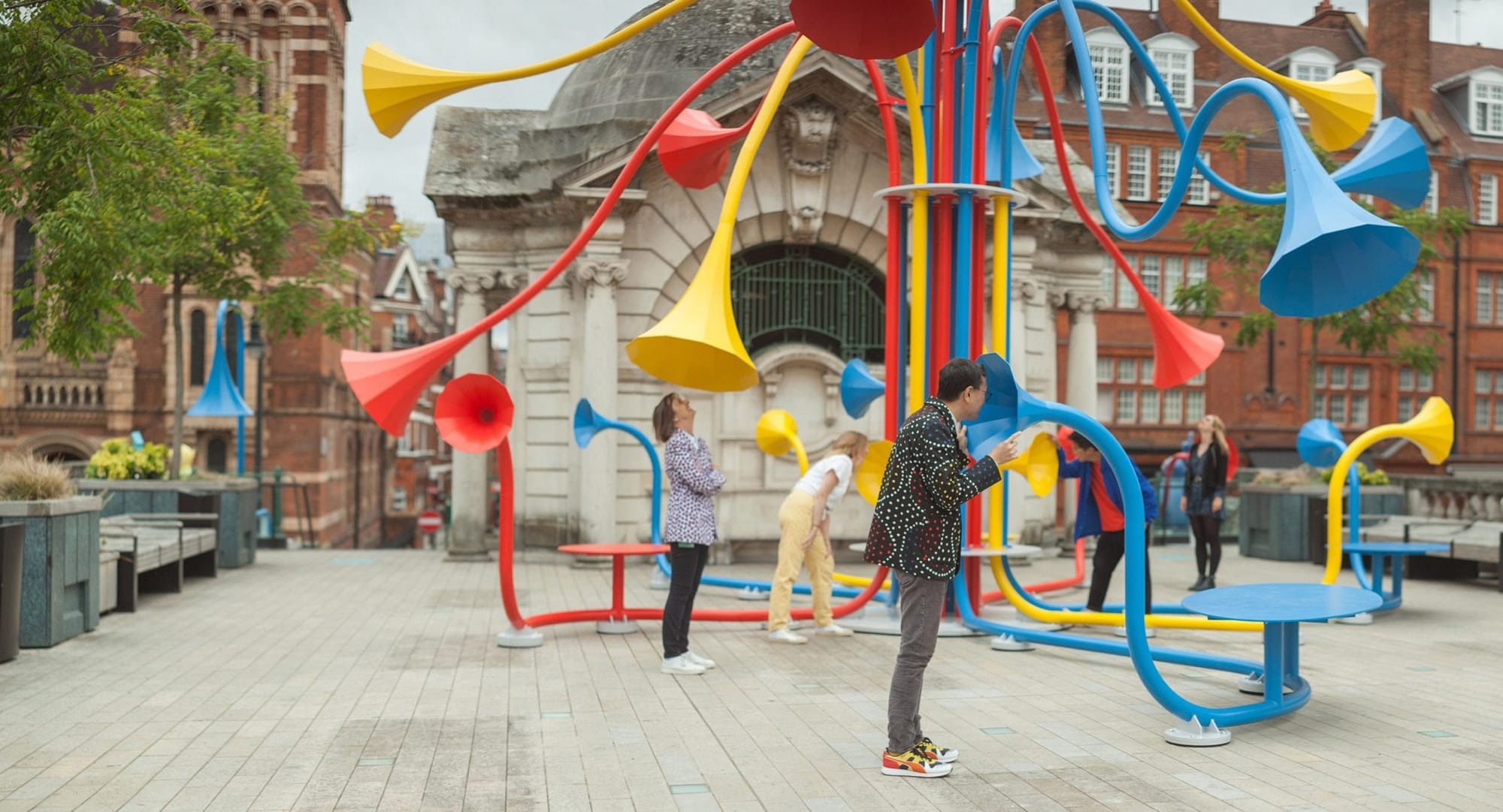 Dikke installatie van Yuri Suzuki in Londen die er niet alleen strak uitziet, maar waarmee je ook met elkaar kunt communiceren. Echo.